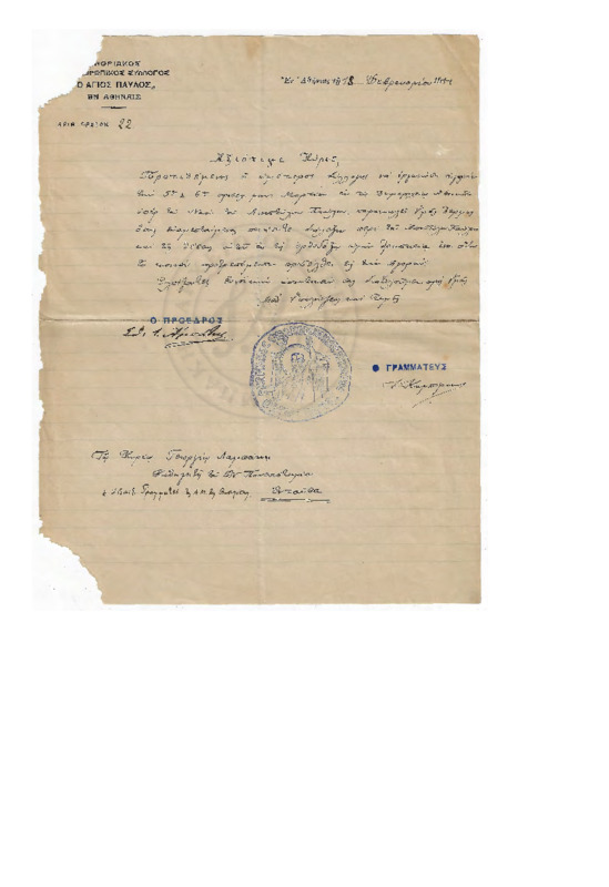 Πρόσκληση του φιλανθρωπικού συλλόγου στο Δημαρχείο για την στήριξη του Ναού του Αγίου Παύλου και παράκληση Γεωργίου Λαμπάκη να δώσει διάλεξη για τον Απόστολο Παύλο.