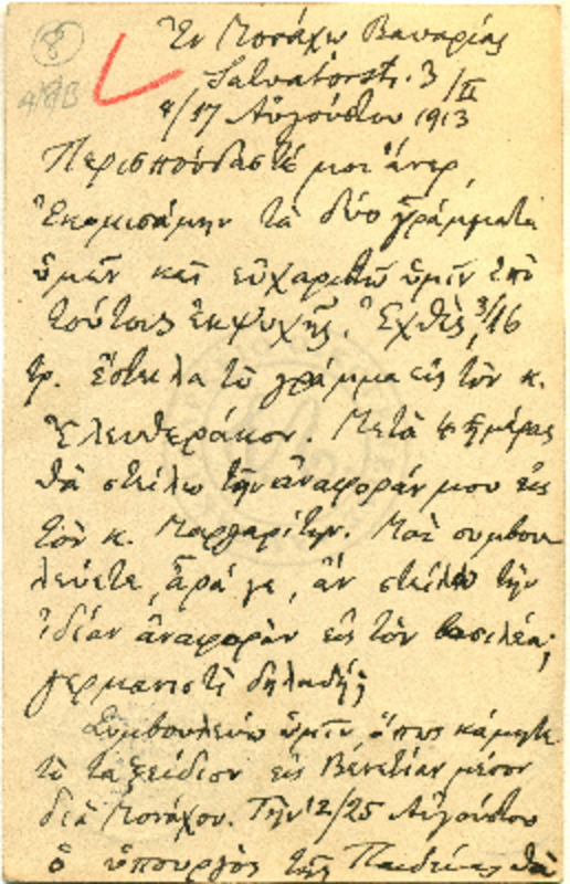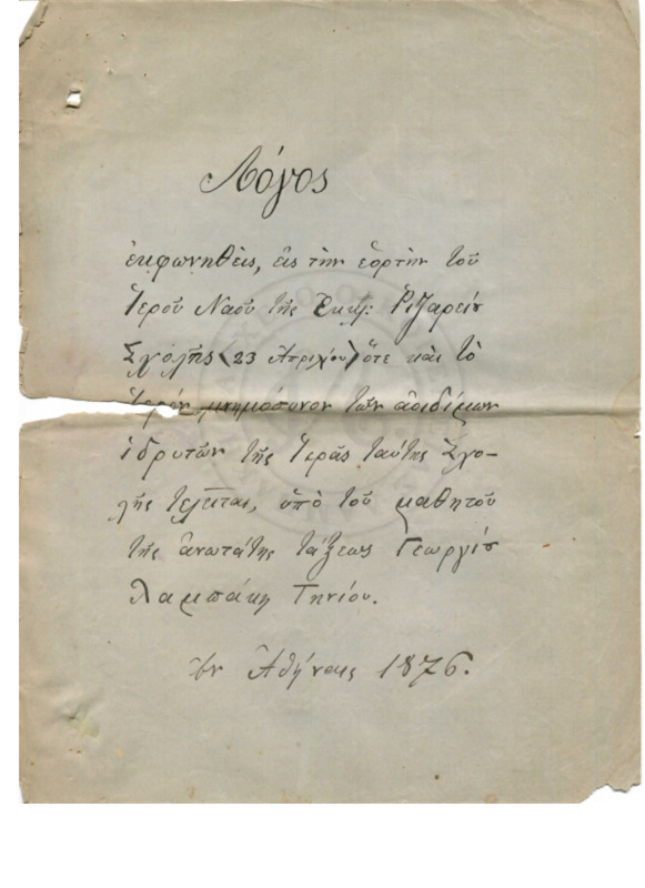 "Λόγος εκφωνηθείς εις την εορτήν του ιερού Ναού της εκκλησίας της Ριζαρείου Σχολής (23 Απριλίου) ότε και το ιερόν μνημόσυνο των αοιδίμον ιδρυτών της Ιεράς ταύτης Σχολής τελείται, υπό του μαθητή της ανωτάτης τάξεως Γεωργίου Λαμπάκη Τηνίου"