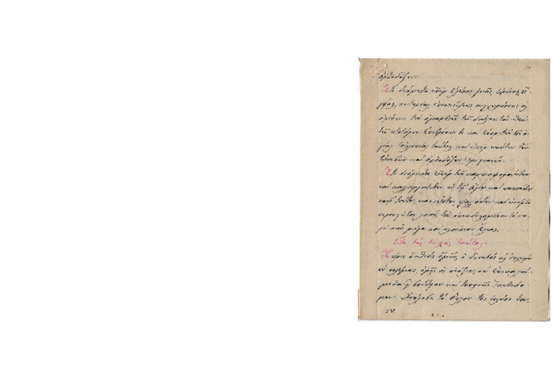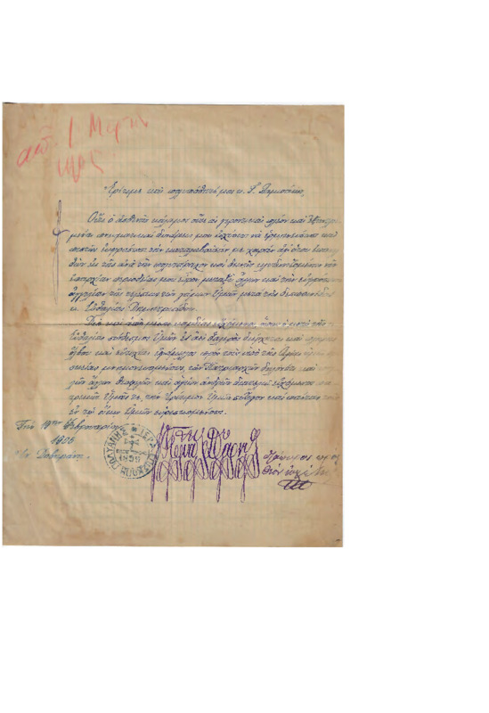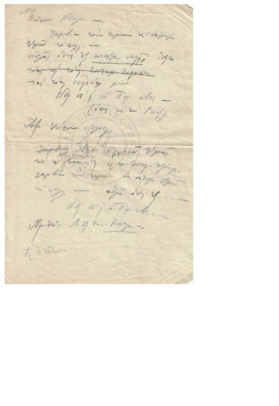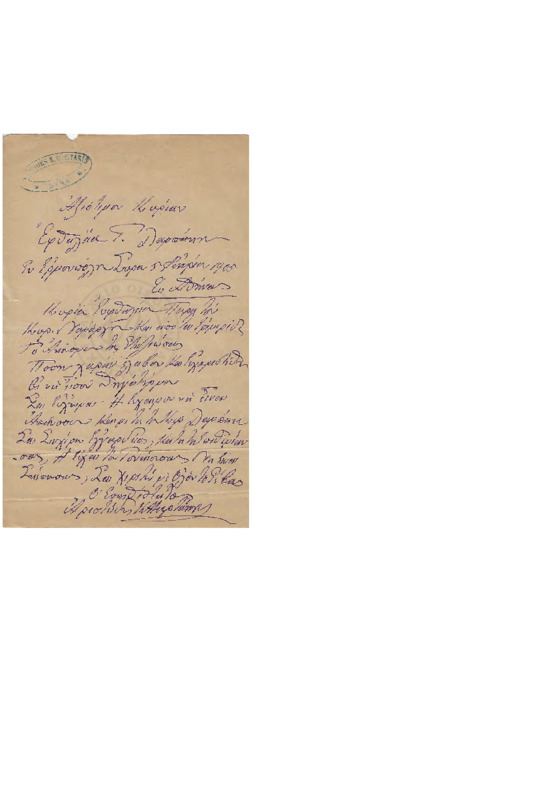 “ Τη 6 Φεβρουαρίου 1908 εν Αγιάσου… Παμφίλτατε Εν Κυρίω Σας εύχομαι. Δια ταύτης Σας πληρωφορώ ότι υγιίνω Ταυθ όπερ και τις υμάς εύχομαι. Μεσον του κυρίου Σταματίου Πατεράκη έλαβον ον Μη επέμψας επί στολίδιον και καθώς μας εγράφετε σας Αποστέλλο την…