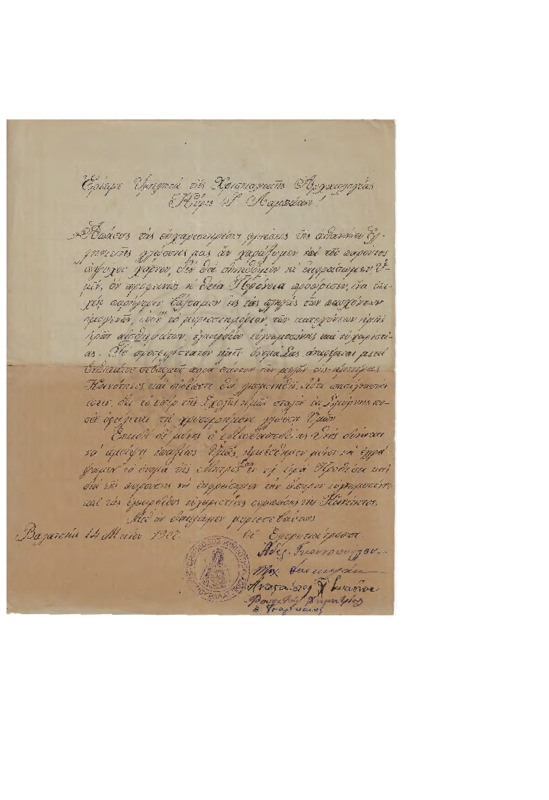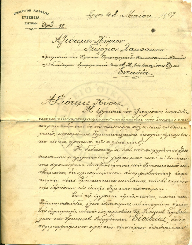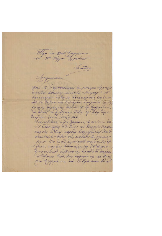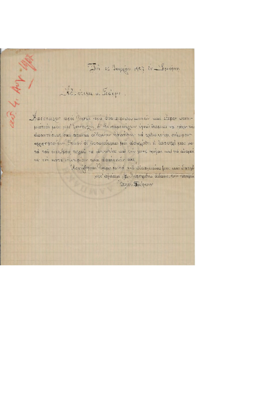 Φιλική απαντητική επιστολή προς Γεώργιο Λαμπάκη, όπου του απαντάει αναφέρει για την διευθέτηση κάποιου θέματος με την "Αρμονία", μεταλλικά νερά και έναν Σταυρό