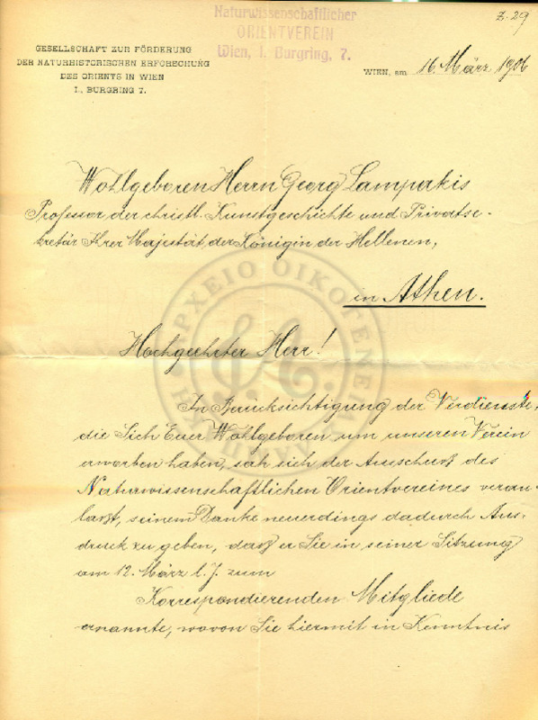 “Τω Εριτίμω και περισπούδαστω φίλω Κυρίω Γεωργίου Λαμπάκη υφηγητή ιδιαιτέρω Γραμματέα της Α.Μ. της Βασιλίσσης εις ανάμνηση. Εις Αθήνας.